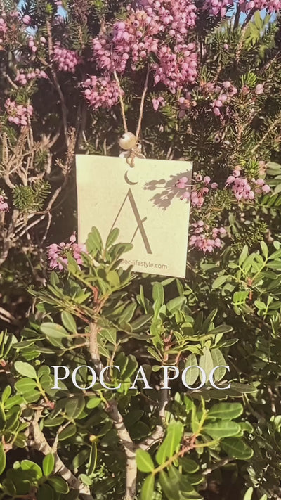 The design features a very flattering V-neck and delicate decorative ribbons that elegantly highlight the waist. The two cords that fall gracefully from the neck culminate in tassels adorned with natural elements, adding a touch of bohemian charm to the piece.