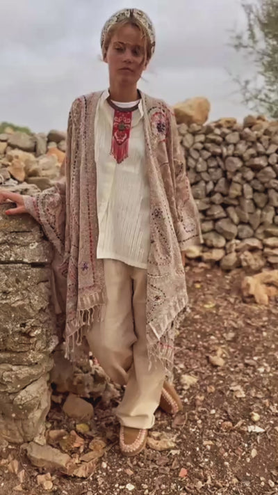 Nuestro exquisito Poncho Amoha es de lana natural bordado a mano destaca por su calidad artesanal y la auténtica esencia de las Islas Baleares. Cada pieza es única, están hechos a mano con cuidado y detalle, lo que garantiza una prenda exclusiva en tu guardarropa. El bordado a mano agrega un toque de elegancia y distinción a este poncho, haciéndolo perfecto para quienes aprecian la artesanía tradicional y la belleza de las prendas únicas. Con la esencia balear impregnada en cada puntada, este poncho es una verdadera obra de arte que refleja la dedicación y el talento de los artesanos locales. ¡Un complemento imprescindible para aquellos que buscan sofisticación y autenticidad en sus outfits!